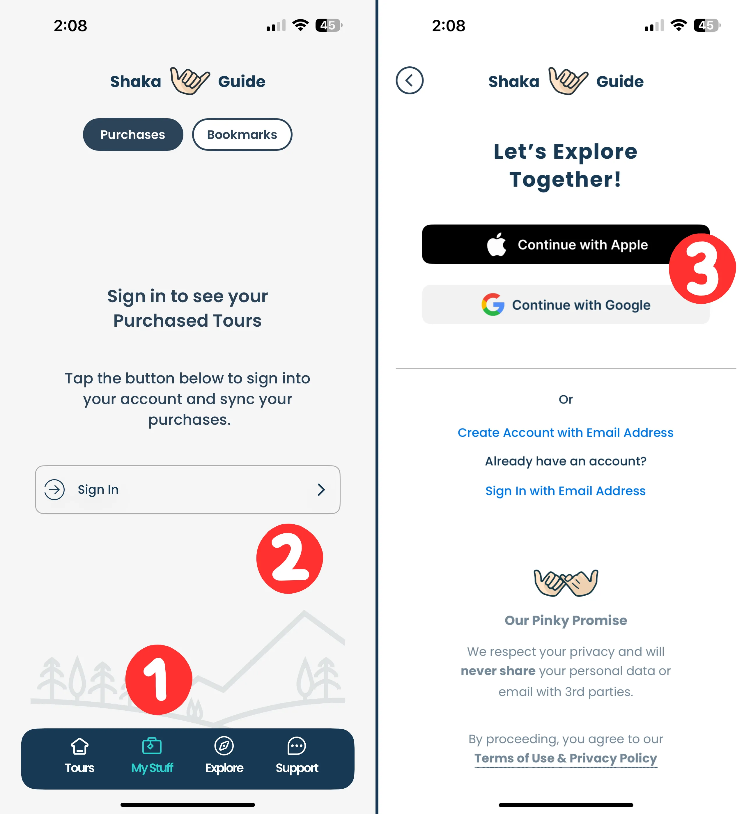 3) Tap on "Sign In" and log in to the app. Make sure you use the same account you created when you purchased your Shaka Guide tour(s).