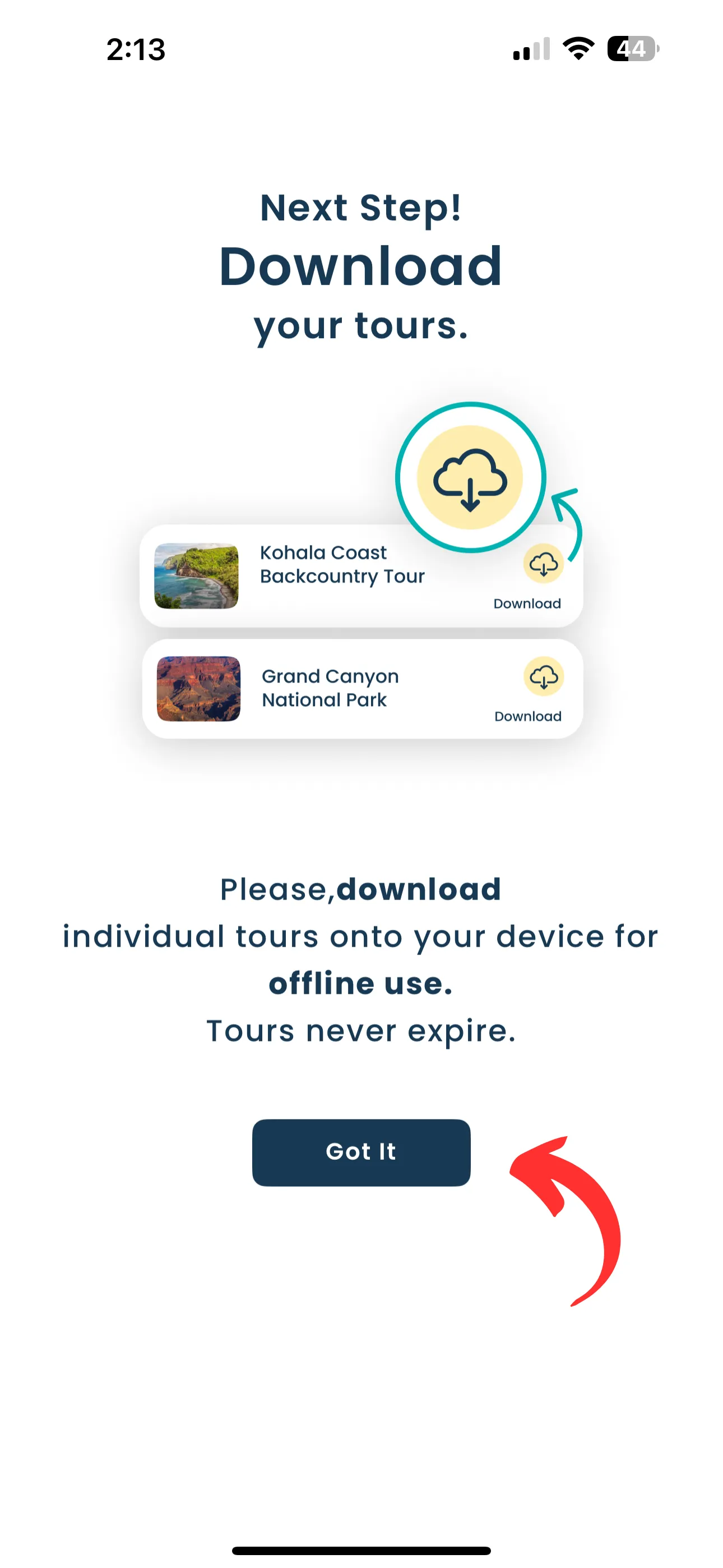 4) If you’ve logged in correctly, the app will recognize and locate your purchased tour(s). Tap on “Got it” to go to the next screen.