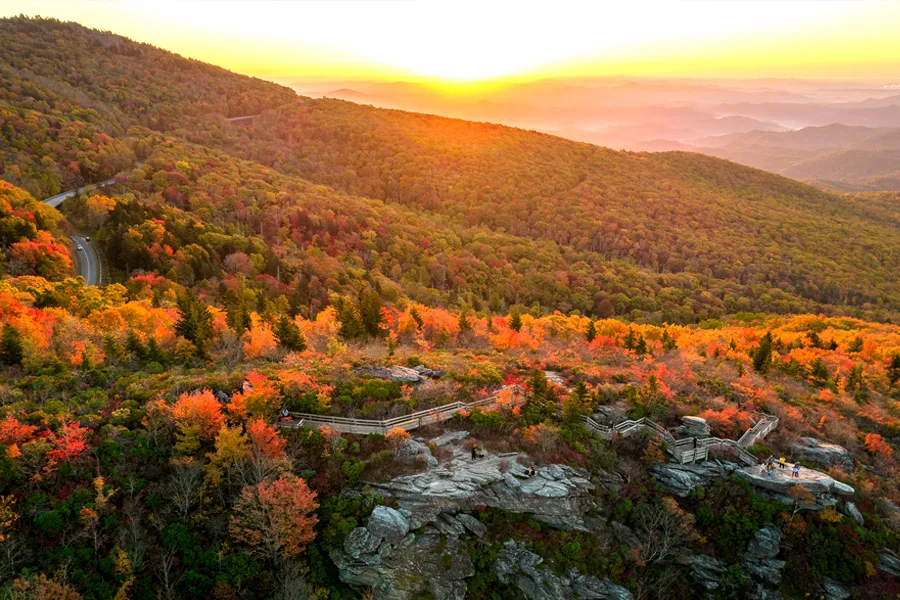 On this tour, we’ll take you from Asheville to Blowing Rock, North Carolina, along 90 of the most scenic miles of the Blue Ridge Parkway. Here you’ll find breathtaking views of mountain ranges fading into the horizon, high-elevation peaks with sweeping panoramic vistas, and close-up views of waterfalls and lakes. You’ll get to walk through dense forests of evergreens, drive through hillsides on fire with color in the fall, and hang out on heath balds that blaze with pink and purple come spring.